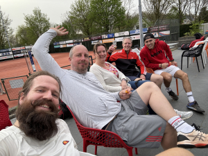 Quote: "Smoesje en verwarring over het team tenue (shirt kwijt geraakt in de was, de kat heeft in mijn tennistas geplast, we zouden toch in het blauwe shirt spelen, oh nee.. ik heb niet voor jou besteld)"